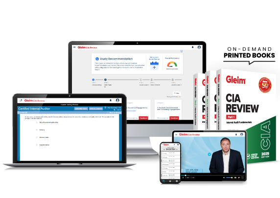 • Gleim CIA Review Course – This online course is your main study tool in this guided, self-study review. This course includes your interactive study planner, exam-emulating quizzes, the Gleim digital book(s) containing comprehensive outlines and examples, the Gleim Instruct video lecture series, and audio lectures. You will also have access to your own mentor, a Personal Counselor who will offer advice and assistance while you are studying for the exam.